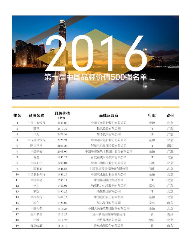 第十屆中國品牌價值500強排名第1名的是中國工商銀行,品牌價值為3030億元,比2015年的2819億元增值211億元。中國工商銀行是第一個品牌價值跨過3000億元的企業,創下了一個新的歷史紀錄。其他排在前10名的品牌價值分別如下:第2名騰訊2617億元;第3名華為2475億元;第4名中國建設銀行2226億元;第5名阿里巴巴2105億元;第6名中國平安2005億元;第7名百度1943億元;第8名中國石化1799億元;第9名中國石油1646億元;第10名中國農業銀行1641億元。前10名的品牌價值總值超過2萬億元,平均每個上榜品牌的價值為2149億元。