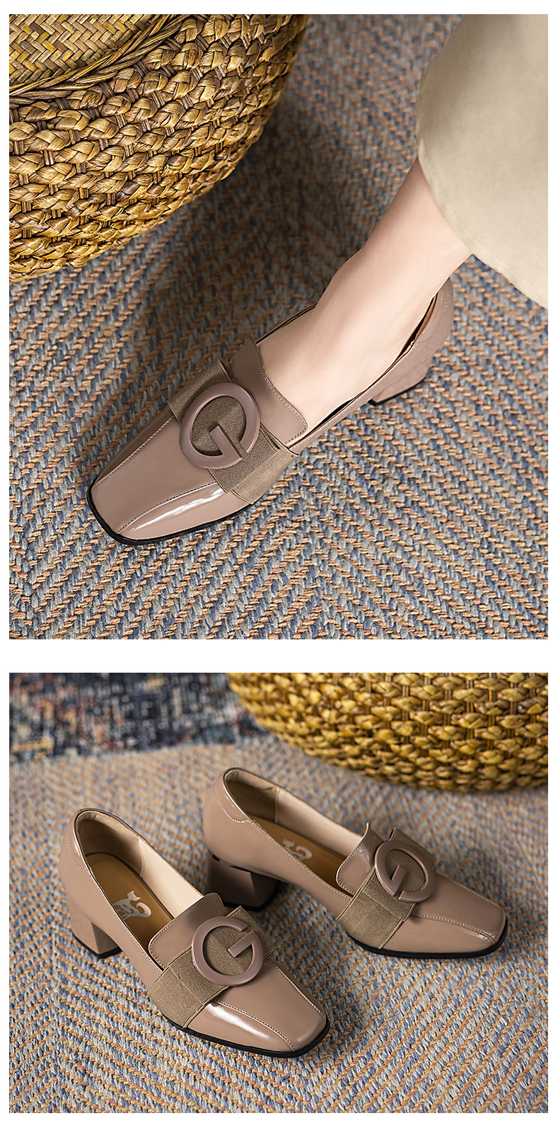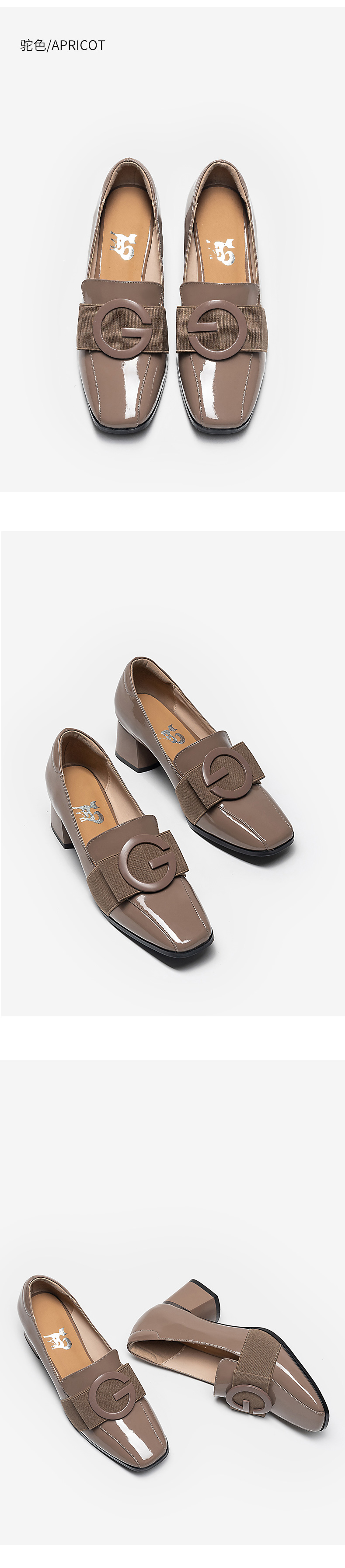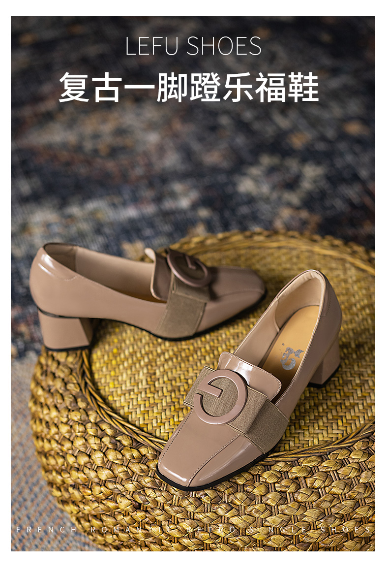 浪莎粗跟單鞋女2021早春女鞋一腳蹬小皮鞋中跟方頭深口真皮樂福鞋